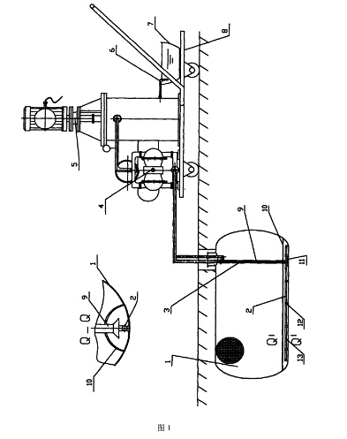 所述的噴油橫管2每間隔300-500毫米的位置設(shè)置有一噴油口13(本附圖給出每380毫米設(shè)置一噴油口或一對(duì)噴油口)。第一位置的噴油口13設(shè)置在噴油橫管2的底部,相繼第二位置的噴油口13設(shè)置噴油橫管2的側(cè)壁上,為兩個(gè)對(duì)稱的噴油口13,如此交錯(cuò)布置,噴油口直徑選為Φ20毫米。在噴射橫管2三個(gè)不同位置焊有卡箍12,卡箍12下支腳座落在防爆儲(chǔ)罐1的罐底上;交錯(cuò)設(shè)計(jì)噴油口13的位置,其目的在于增強(qiáng)清污隧道10內(nèi)清潔油攪動(dòng)油泥的沖力并形成油、污混合流,同時(shí)又吸油管9受到氣動(dòng)隔膜泵4的吸力,迫使清污隧道10內(nèi)油、污混合流的流動(dòng)。