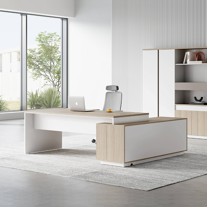 1、基材:符合E0級(jí)標(biāo)準(zhǔn)的MFC板材 2、行政桌副柜可左右互換/副柜配有3個(gè)86插座 3、線盒:銀色翻蓋線盒 4、副柜配有抽屜帶機(jī)械鎖 5、支撐腳V造型鑼工藝線,涂黑色